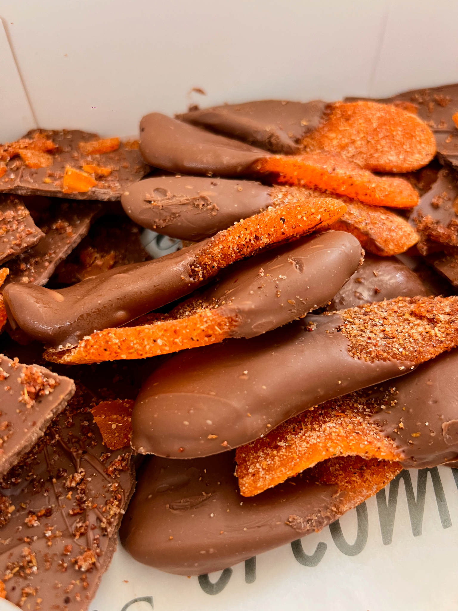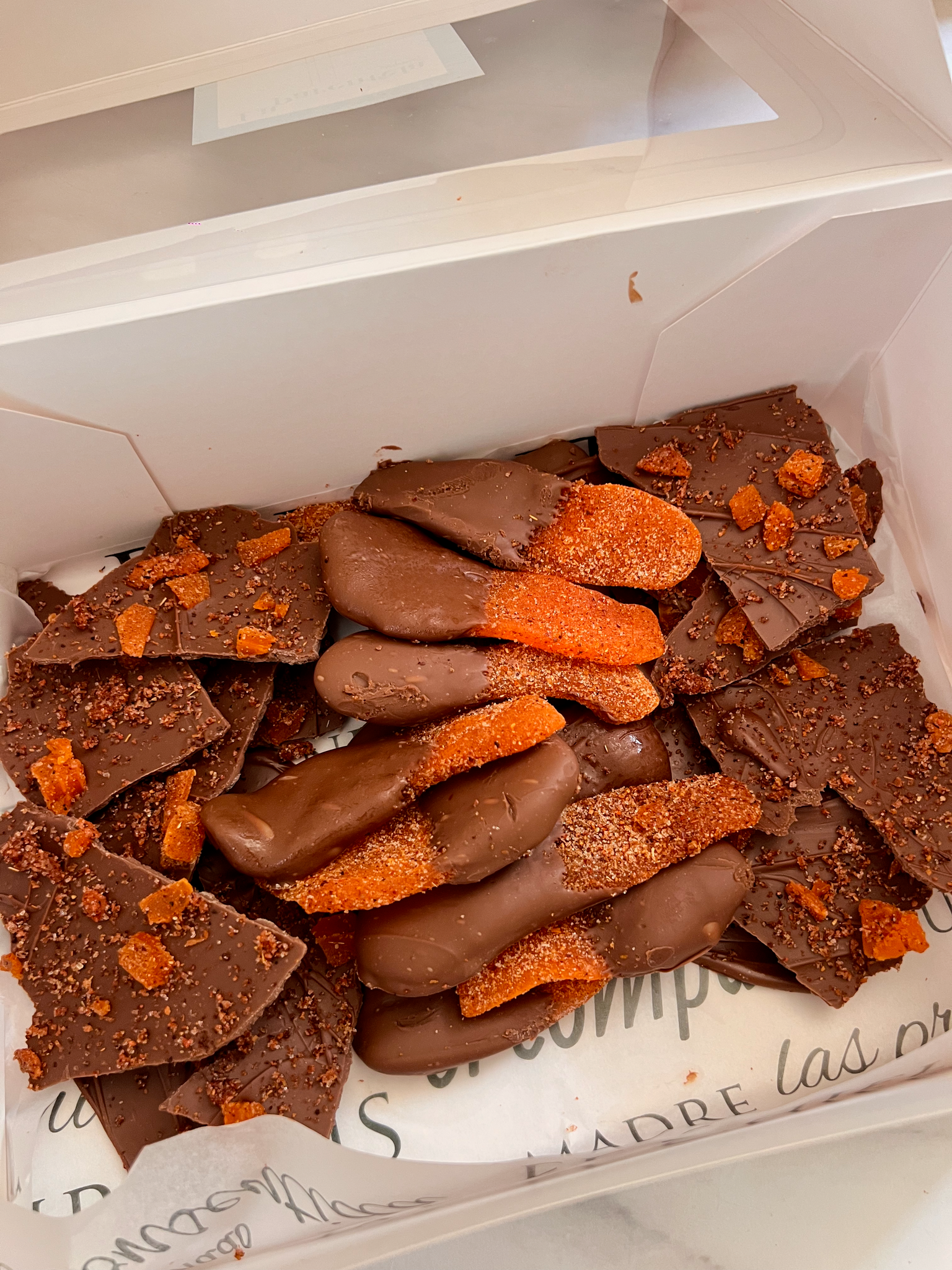 Caja con 620 gr de manguitos cubiertos de chile y chocolate + bark de chocolate con manguito y piña enchilada.