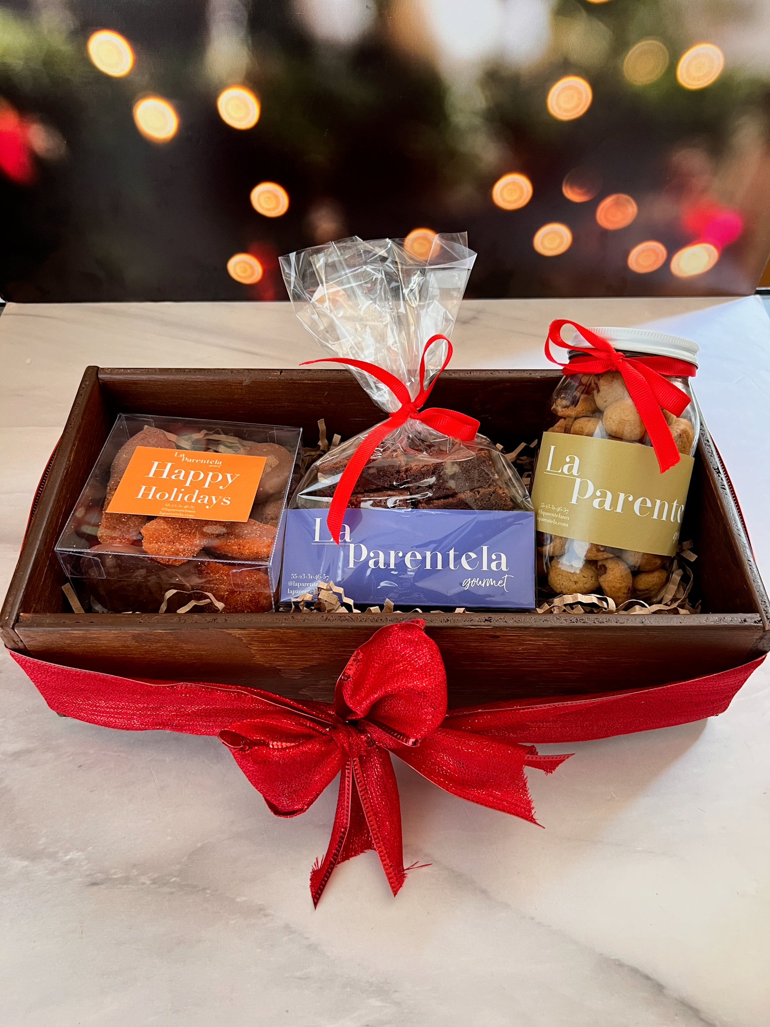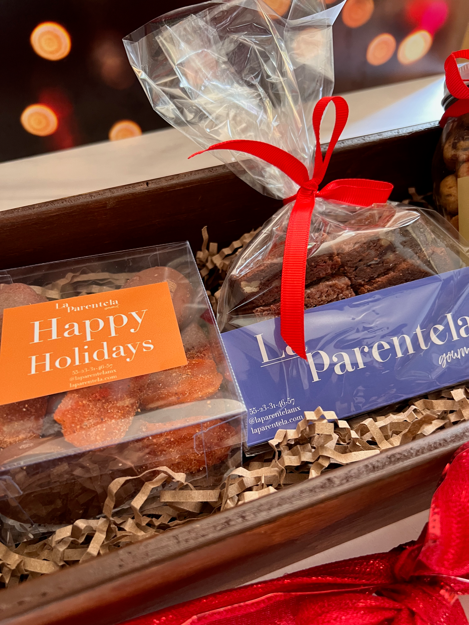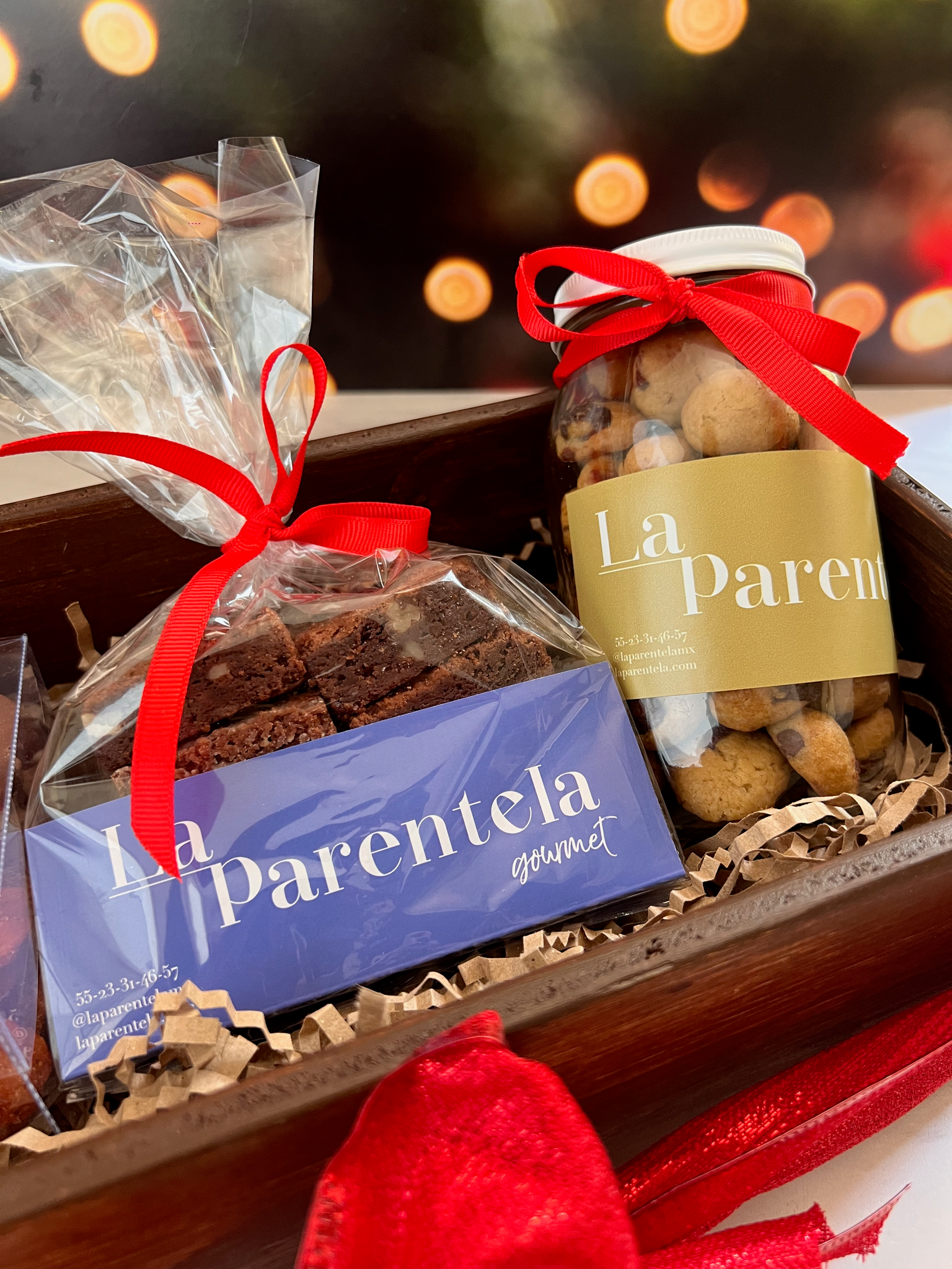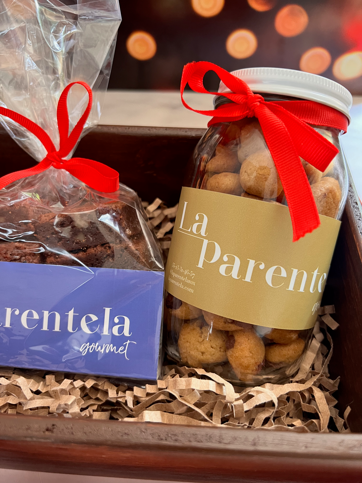 Caja de madera con: jar relleno de tu preferencia, bolsa con 8 brownies y caja de 10x10 rellena con tus productos favoritos.