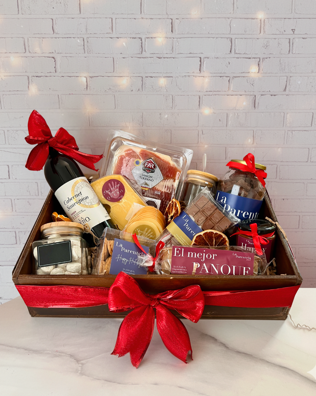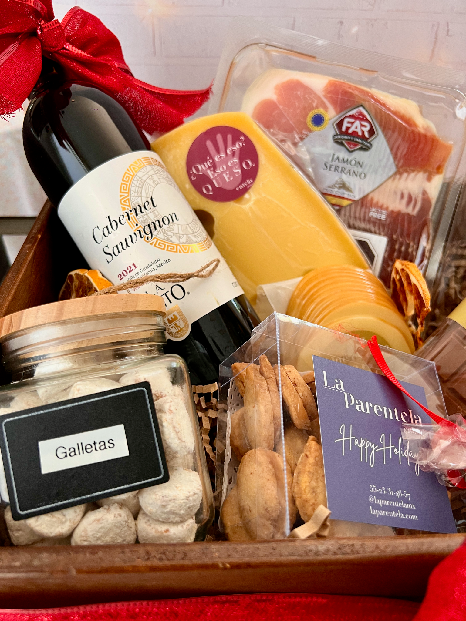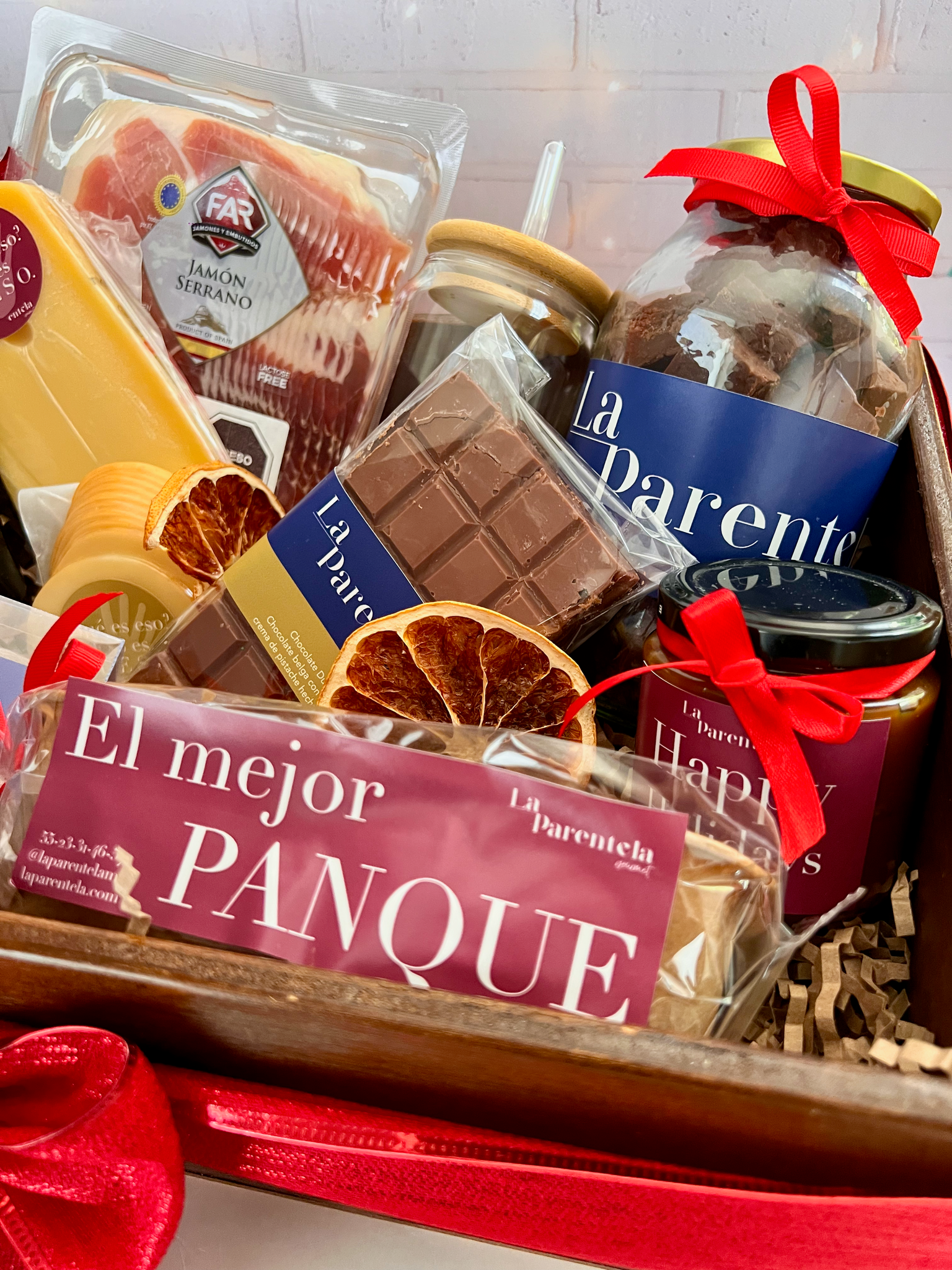 Caja de madera que incluye: panqué de plátano, barra de chocolate Dubai, jar grande, jamón serrano, queso provoleta, queso emental, vaso de vidrio con tapa de madera y popote de vidrio, caja con galletas y jar reutilizable con galletas.