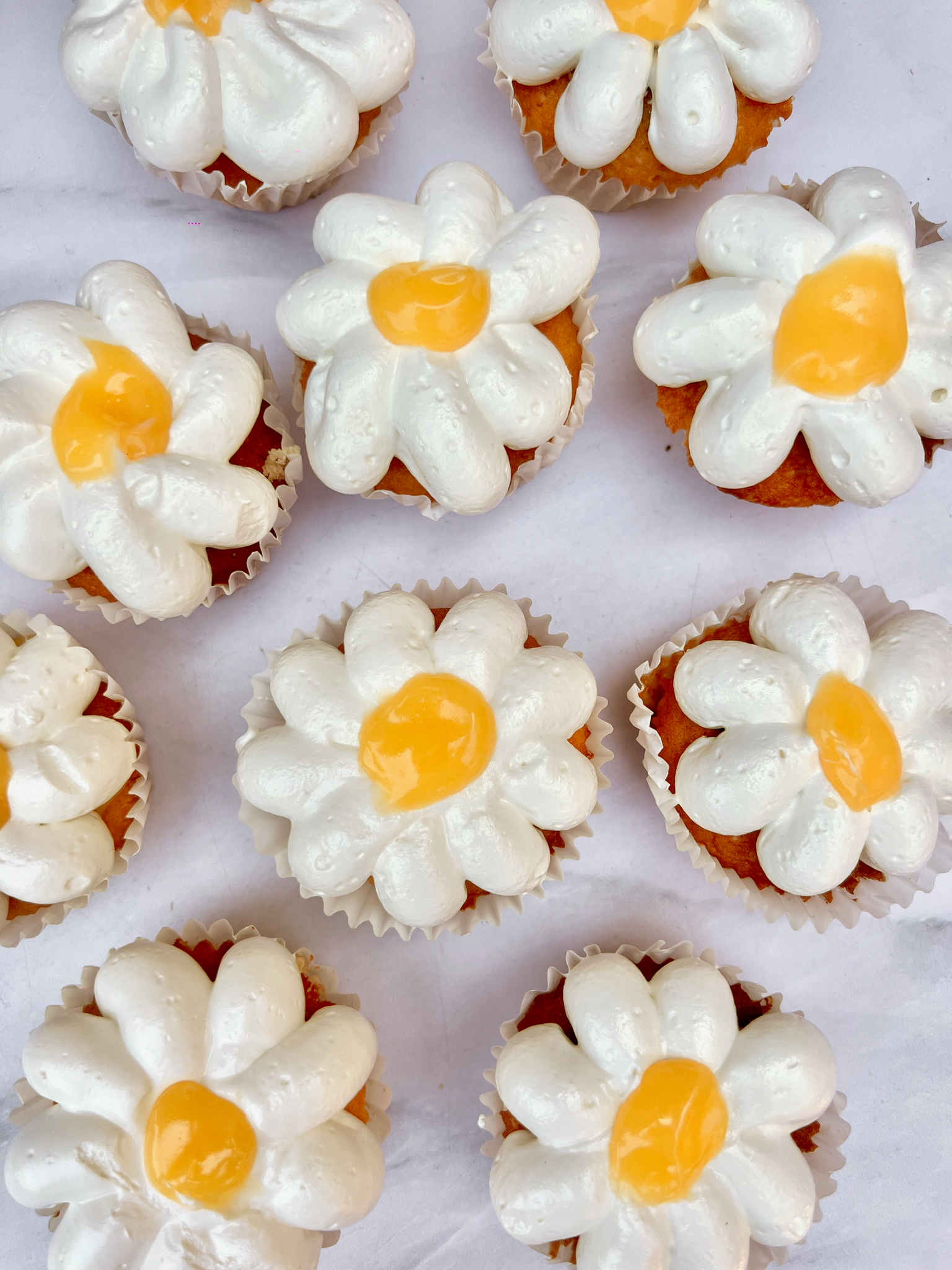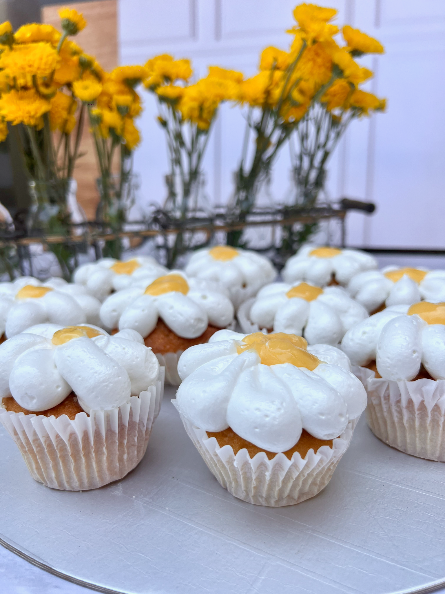 Cupcake de vainilla relleno de lemon curd decorado con merengue como flor margarita. Caja con 6 piezas.