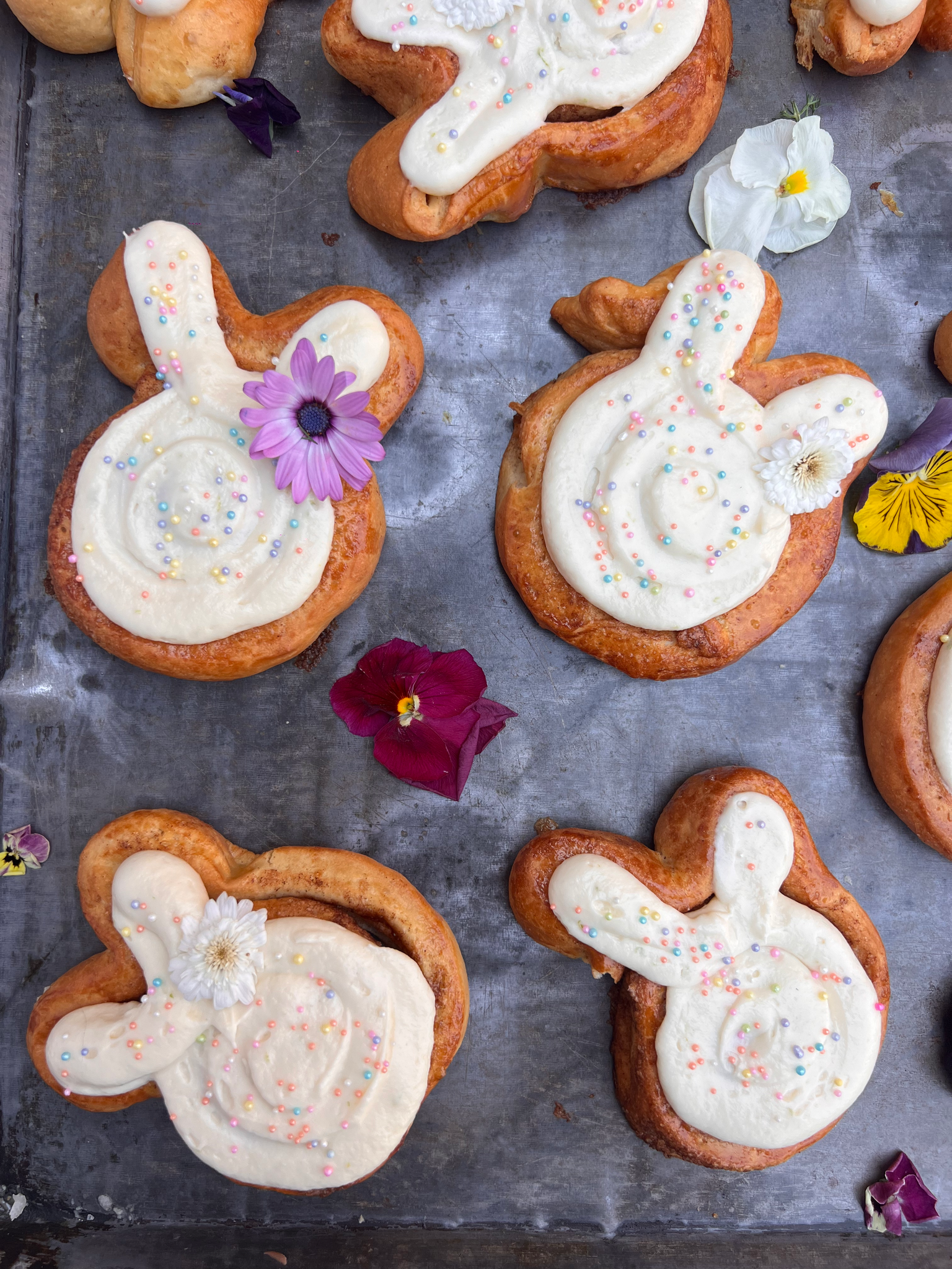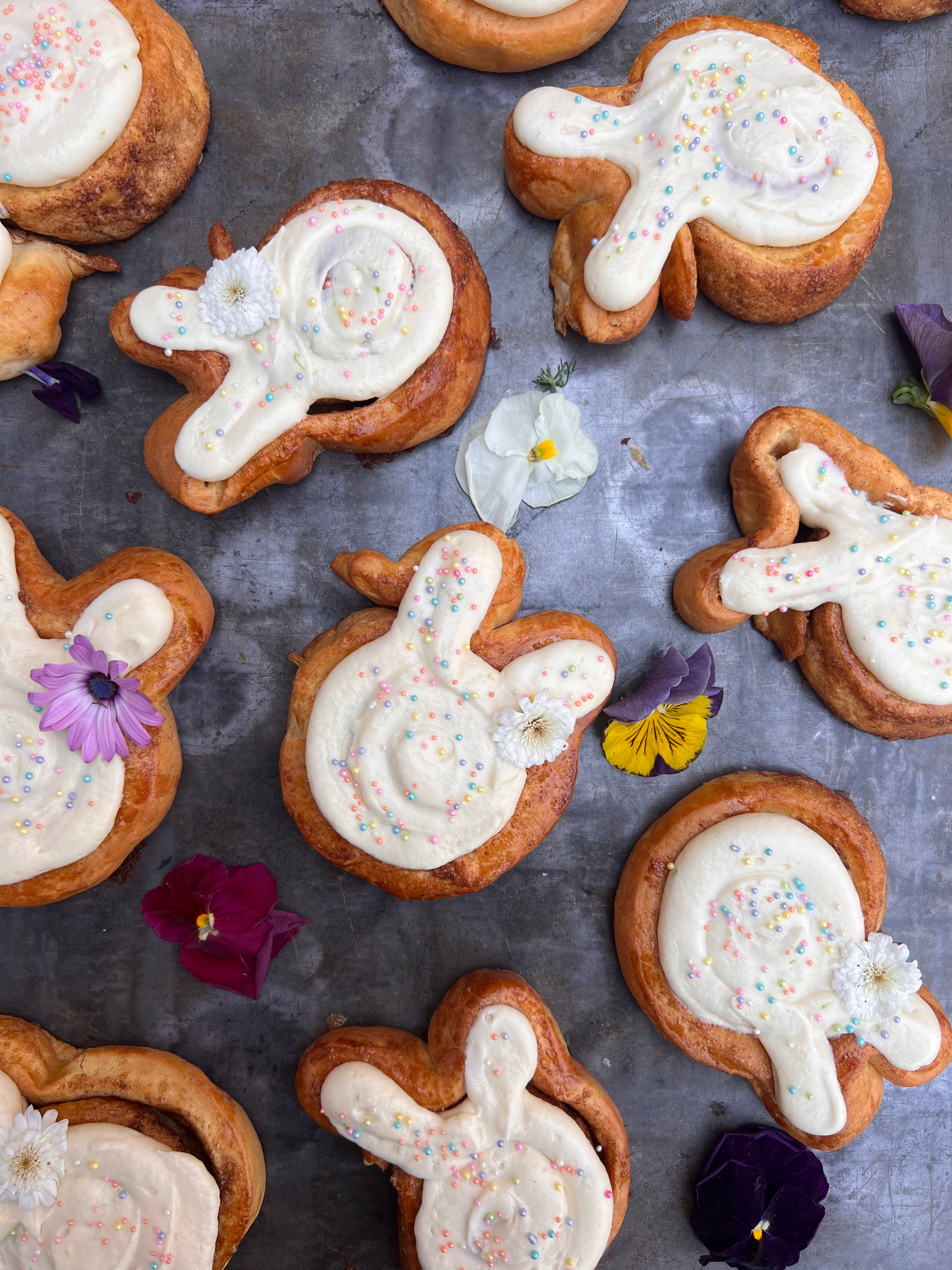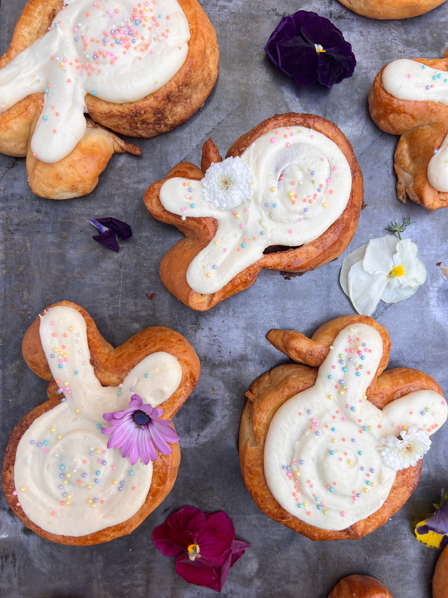 Roles de canela con glaseado de queso Philadelphia en forma de conejo de Pascua.
